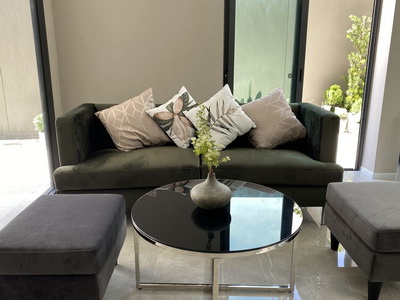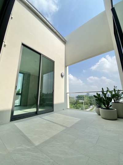 ความพิเศษคือบ้านนี้ดีไซน์ให้มี Double Volume เพดานสูง 6.2 เมตร และมีห้องพระแยกไว้เป็นสัดส่วน มี Sky Court บนชั้นดาดฟ้าที่เชื่อมต่อห้องนอนทั้ง 2 ห้องไว้ด้วยกัน